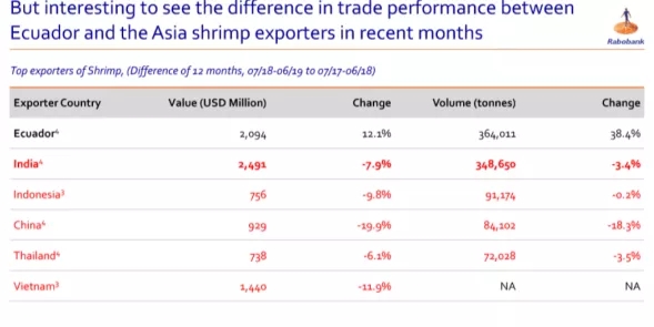 最后,Nikolik提供的数据显示,与前12个月相比,2018年7月至2019年6月期间,亚洲虾生产商的产量和出口价值下降了多少。