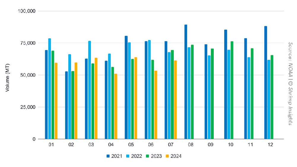 近期,美国虾进口市场呈现出新的趋势。继6月份进口量同比下降14%后,7月份再次下滑12%,今年至今的进口总量也显著低于往年,分别比2023年、2022年和2021年减少了4%、19%和16%。在主要供应国方面,厄瓜多尔和印度的表现截然不同。7月份,美国从厄瓜多尔的进口量大幅下滑30%,这可能与初步反倾销关税的实施有关。相比之下,从
