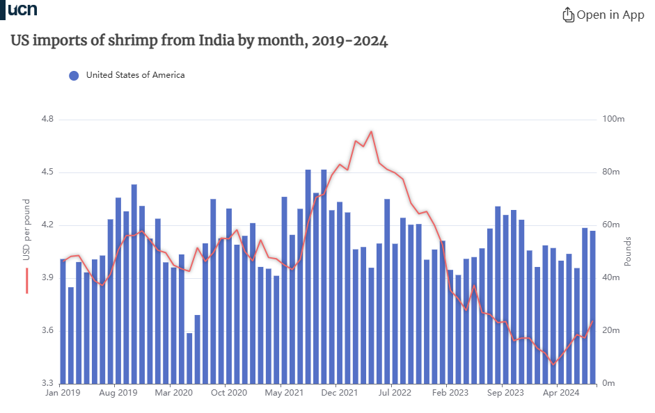 近年来,印度作为全球虾类出口的重要国家,特别是在2024年7月,南美白对虾出口量达到了70,070公吨,同比增长5%,年度出口总量也实现了4%的同比增长。然而,进入8月份后,印度的虾出口市场却出现了转折。尽管印度一直是美国主要的虾供应国,但8月份的出口数据却显示,向美国的出口量显著下降,与7月份相比,出口量和价值均下