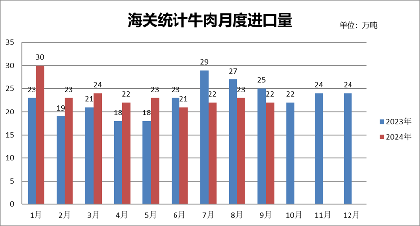 2024年9月,中国牛肉进口市场呈现出高位运行但略有下滑的态势。据数据显示,9月我国牛肉进口总量为22万吨,延续了自去年6月以来连续16个月单月进口量超过20万吨的高位运行趋势。然而,与上月相比,牛肉进口量减少了约1万吨,显示出一定的市场波动。这一市场动态主要受到多重因素的影响。首先,巴西作为中国的主要牛肉进口来