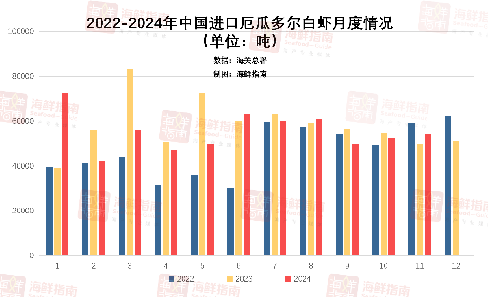 2024 年 11 月中国进口暖水虾数据呈现出多维度的变化态势。当月中国共到港 7.9 万吨暖水虾,同比增长 6%。其中,厄瓜多尔白虾占据大头,达 5.4 万吨,约 2718 柜。从整体进口量来看,1 - 11 月中国共进口 82.6 万吨暖水虾,厄瓜多尔白虾就有 60.8 万吨。进口结构方面,11 月 7.7 万吨带壳虾与 0.2 万吨虾仁共同构成了 7