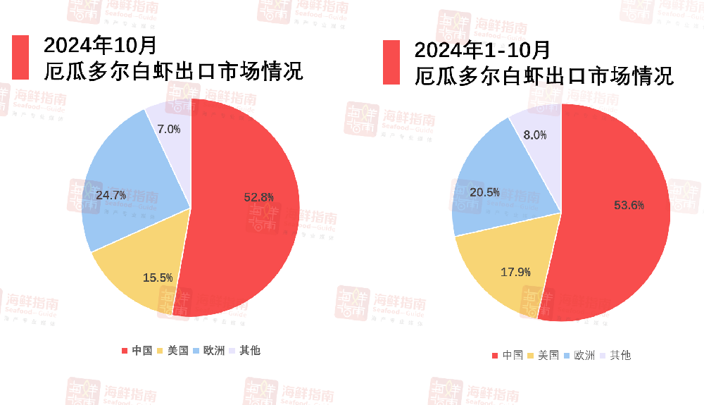 2024 年 10 月,厄瓜多尔白虾出口形势严峻,出口量与出口额均显著下降,创下今年新低。据厄瓜多尔水产养殖商会(CNA)数据,当月该国共出口 8.6 万吨白虾,同比下跌 12.27%;出口额为 4.4 亿美元,同比跌 10.94%。中国作为厄瓜多尔白虾的主要市场,受冲击较大。10 月对华出口量约 4.5 万吨,同比跌 12.46%,环比减少 5600 多