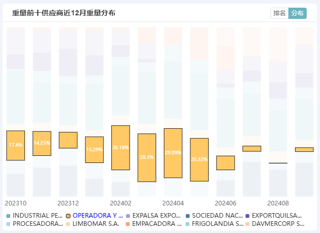 2024年9月,根据最新的厄瓜多尔虾类出口数据,该月厄瓜多尔共向中国出口了5.47万吨白虾,约合2604柜。在这批出口中,前十大供应商占据了71.72%的市场份额,显示出它们在厄瓜多尔白虾对华出口中的主导地位。一、领先供应商风采INDUSTRIAL PESQUERA SANTA PRISCILA S.A.出口中国量:8275吨,约合374柜占总进口比例:14.36%排名