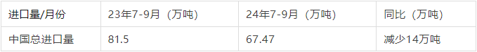 2024年第三季度(7/8/9月)牛肉进口量同比去年减少了14万吨(约5185柜),据海关总署公布的最新数据,2024年9月中国牛肉进口量为22.12万吨,与前两个月相比虽有所波动,但整体保持在相对稳定的水平。然而,与去年同期相比,这一数字却出现了明显的下滑。具体来说,2024年第三季度中国牛肉进口总量为67.47万吨,而去年同期则