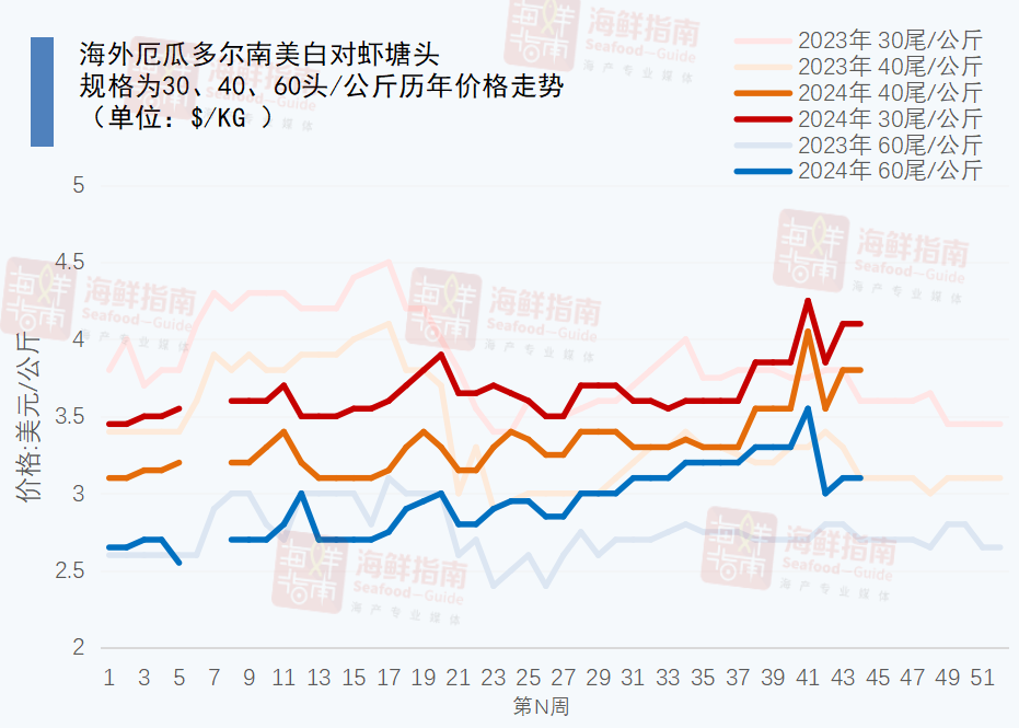 近期,随着青岛第27届中国国际渔业博览会的开幕,白虾市场的动态更加引人关注。据进口商反馈,尽管大部分厄瓜多尔白虾工厂的期货报价尚未更新,但市场普遍预期在展会期间将有一轮新的博弈和报价调整。值得注意的是,已有小部分工厂的50/60规格白虾期货价格出现了轻微下调,但下调幅度有限,仅为每公斤0.1美金。但整体而言,