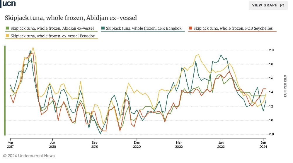 据最新数据显示,10月份在泰国曼谷交付的金枪鱼价格为每吨1400美元。而市场消息人士预测,进入11月份后,这一价格可能会进一步上涨至每吨1500美元。这一预测并非空穴来风,因为每年在这个时间段,金枪鱼的市场需求并未出现明显的缓和,反而因节日和消费习惯的推动而持续旺盛。因此,供货商们有动机也有能力将价格推高,以获
