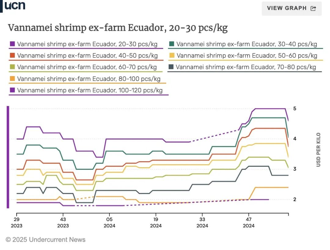 Ecuadorian industry insiders expressed concern about this, saying that the market outlook for 2025 is challenging. In addition to the uncertainty of the domestic market, the weakness of China demand has brought great pressure to Ecuador's shrimp industry. During the Spring Festival, although the demand in the China market rose somewhat, it fell rapidly after the festival, making it difficult to maintain the price of shrimp in Ecuador.
